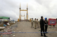 Flashing colored lights along the sides of the small bridge at the heart of the disaster shed a fitful light on the scene -- a road strewn with shoes, clothes and possessions discarded in the panic that gripped the crowds when the crush occurred.