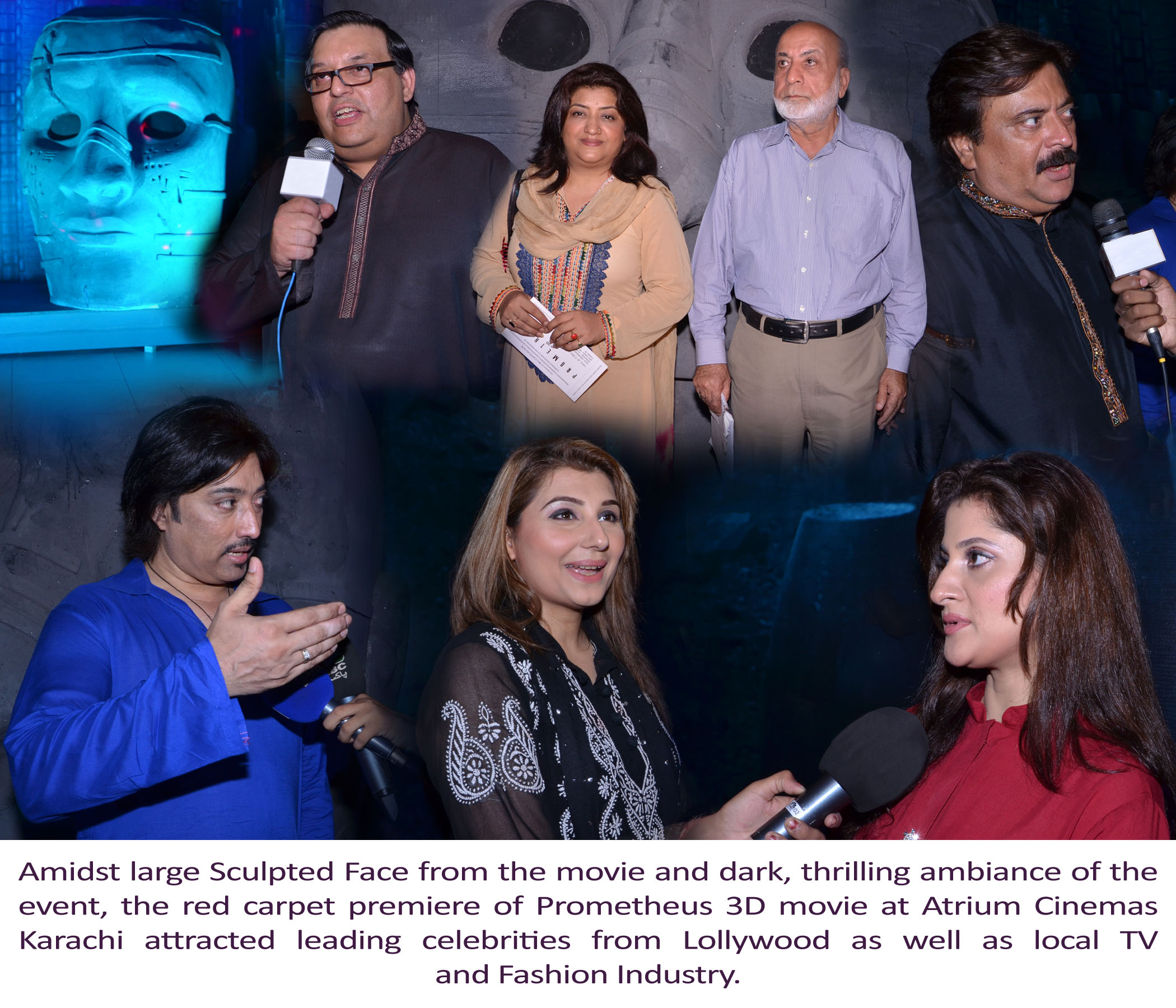 Karachi – 8th June, 2012: The much awaited Prometheus finally made its screen debut today at Karachi Atrium Cinemas. The 3D movie which is a sci-fi thriller directed by Ridley Scott attracted many known faces from the entertainment industry of Pakistan at its red carpet premiere, where the guests were enthralled by the movie’s special effects and story-line.