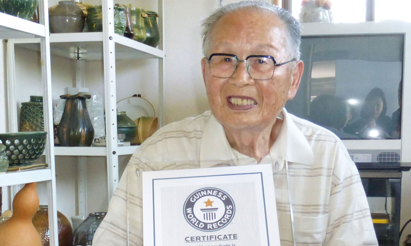 Spritely senior Shigemi Hirata received his Guinness World Records certificate on Friday after earning a Bachelor of Arts degree in ceramics from Kyoto University of Art and Design in March, local media reported Saturday.