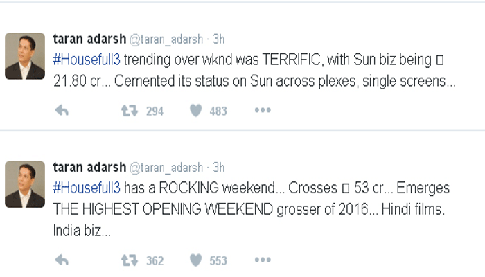 #Housefull3 was EXCEPTIONAL on Sun... Fri 15.21 cr, Sat 16.30 cr, Sun 21.80 cr. Total: ₹ 53.31 cr. India biz... Growth on Sun: 33.74%. FAB!