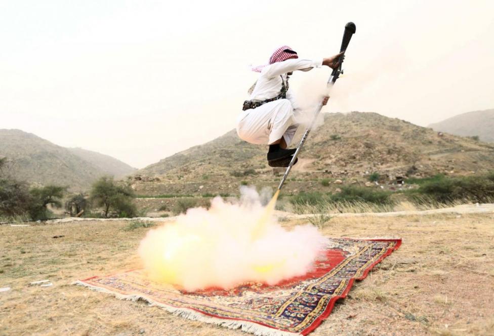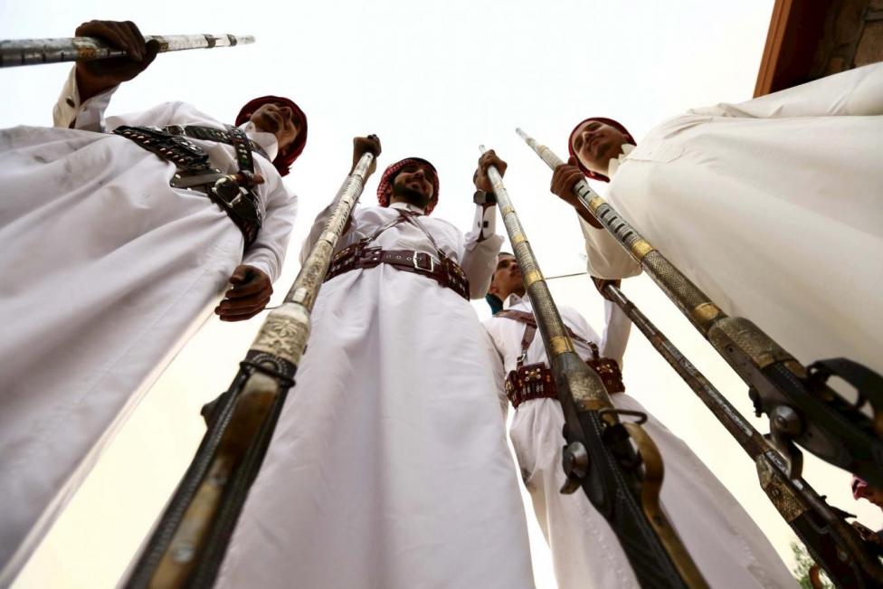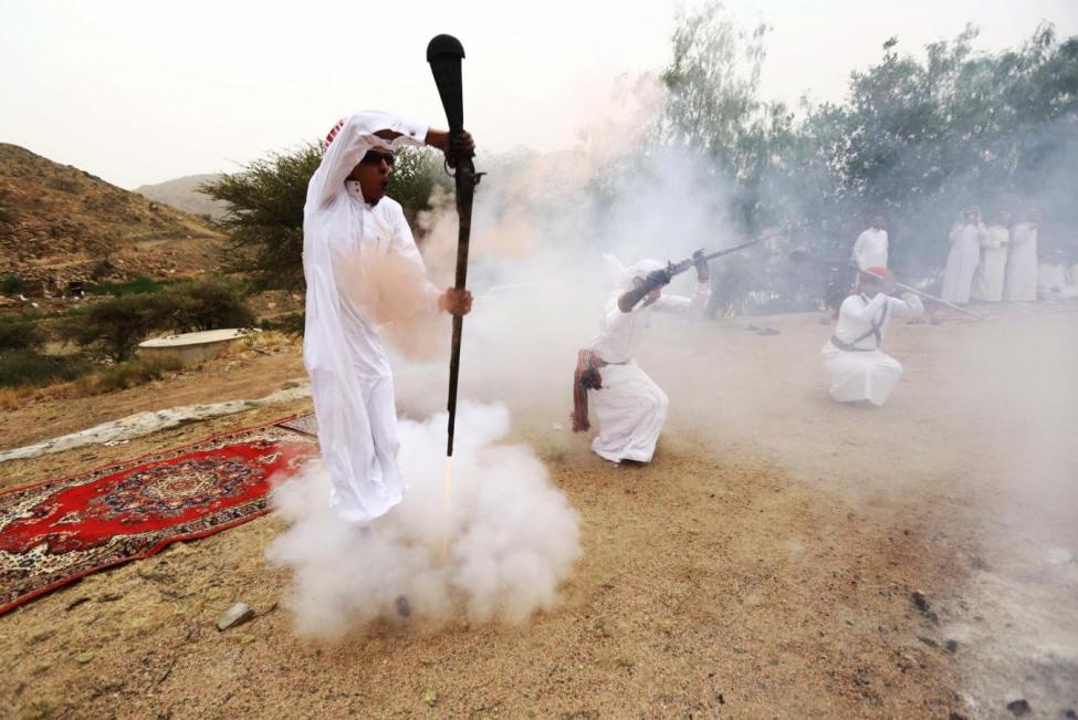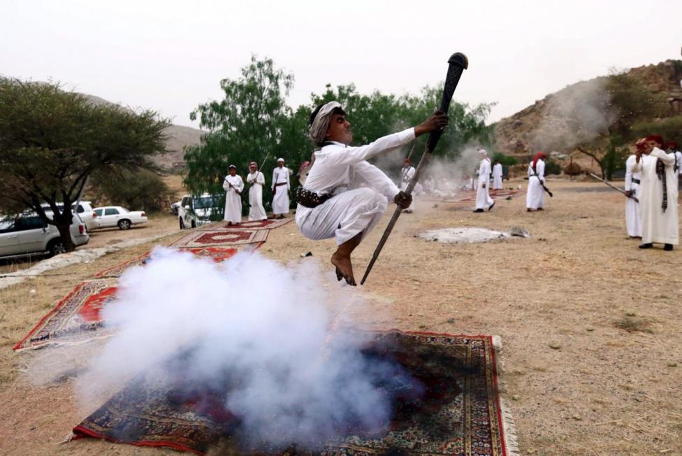 A man fires a weapon as he dances during a traditional excursion near Taif, Saudi Arabia. Saudis usually participate in such excursions as they celebrate weddings or graduations. REUTERS