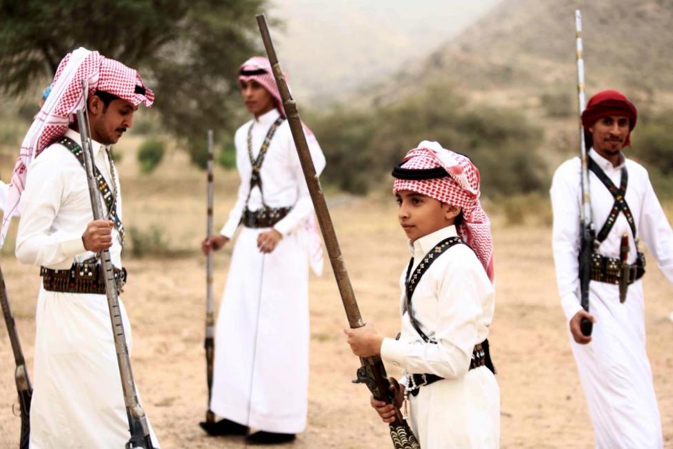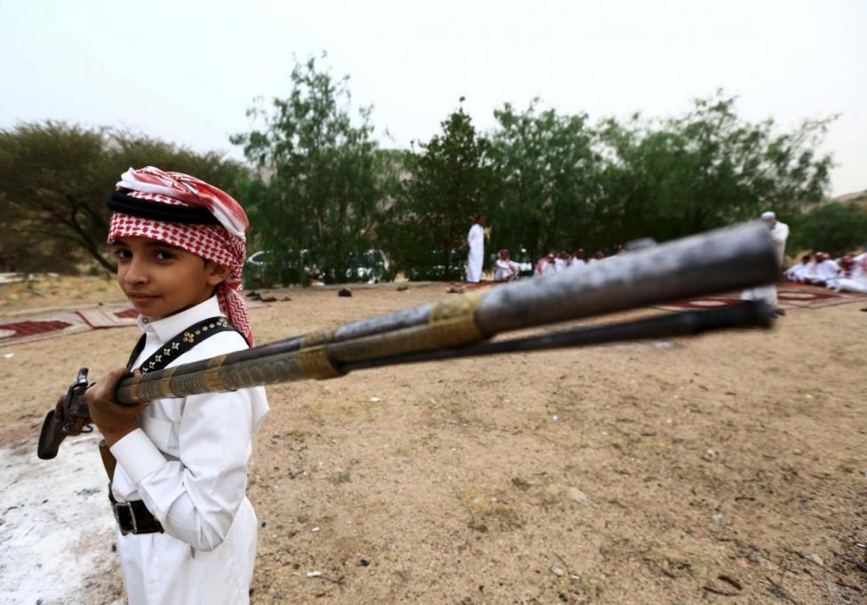 A boy holds a weapon as he poses for a photo during a traditional excursion near the western Saudi city of Taif. REUTERS