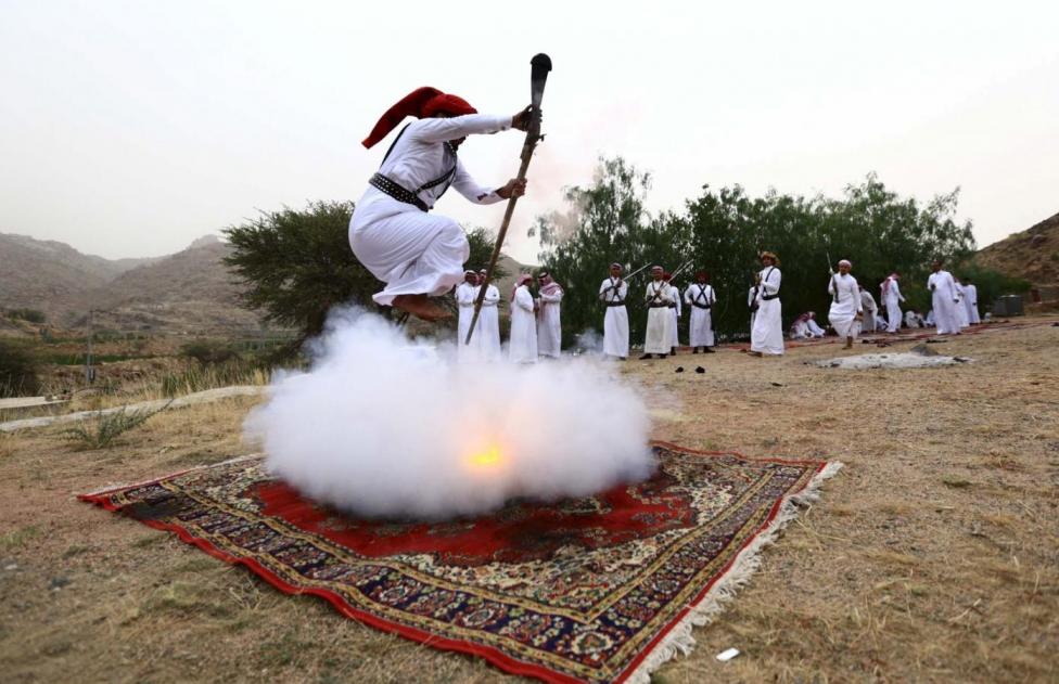 A man fires a weapon as he dances during a traditional excursion near the western Saudi city of Taif. REUTERS