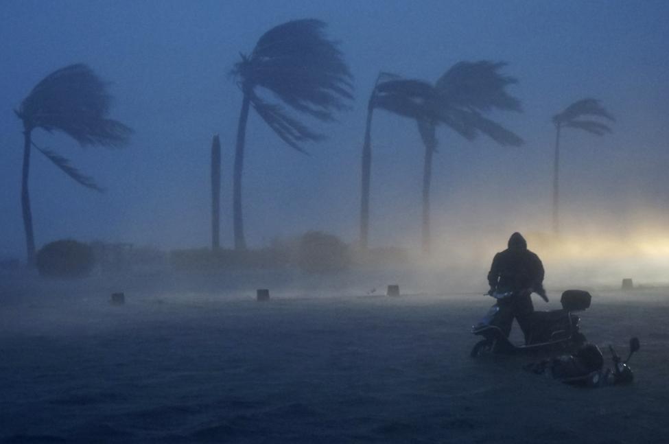 A man pushes his electric bicycle against strong wind and heavy rainfall along a flooded seaside street as Typhoon Rammasun hits China's Hainan province, REUTERS
