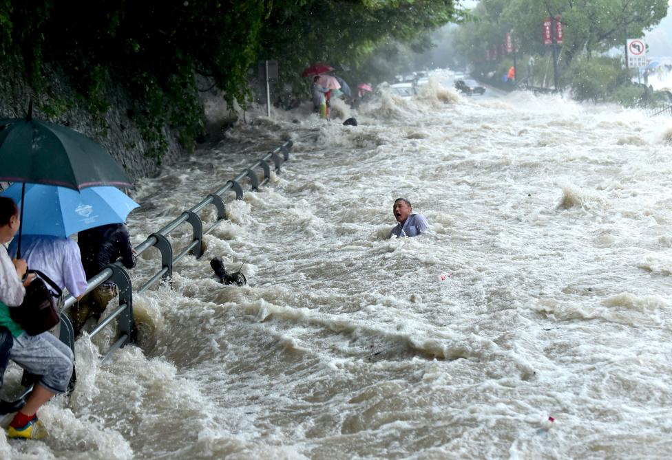 A tourist struggles in the water, before standing up and wading away, after a wave strengthened by the influence of Typhoon Dujuan hit a river bank in Hangzhou,REUTERS