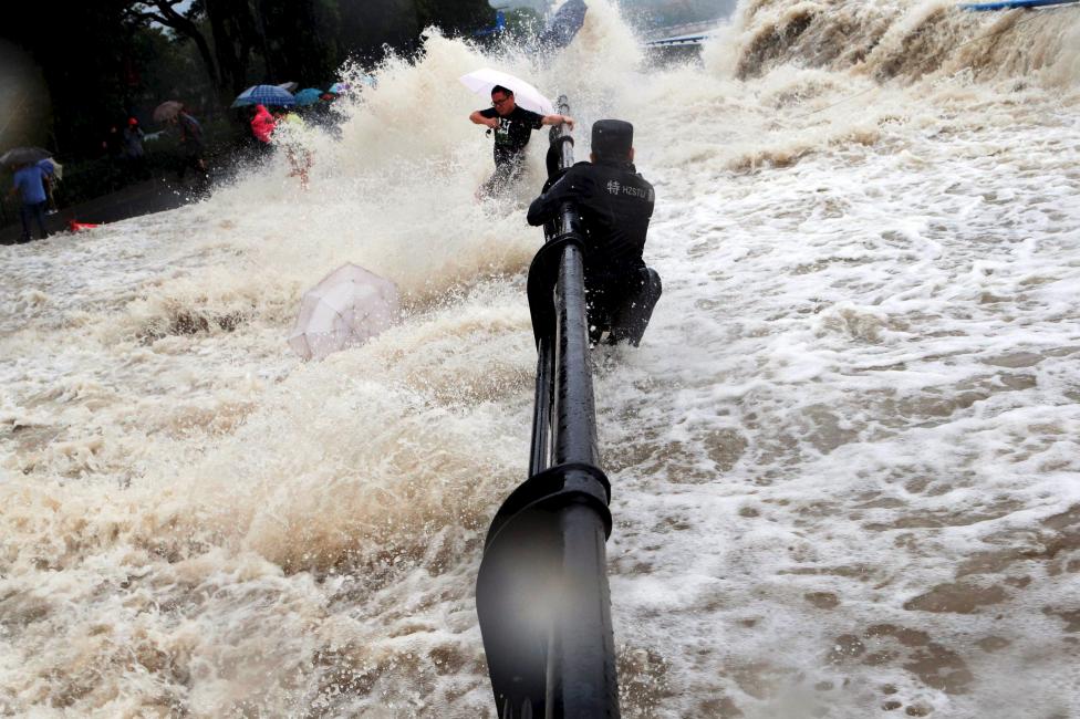 A paramilitary policeman holds onto a fence as tourists dodge tidal waves increased under the influence of Typhoon Dujuan, REUTERS