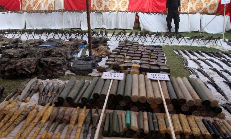 -File PhotoKARACHI: Huge cache of weapons which was recovered on Wednesday from Azizabad, handed over today on Thursday to Pakistan Army, Aaj News reported. Â Â