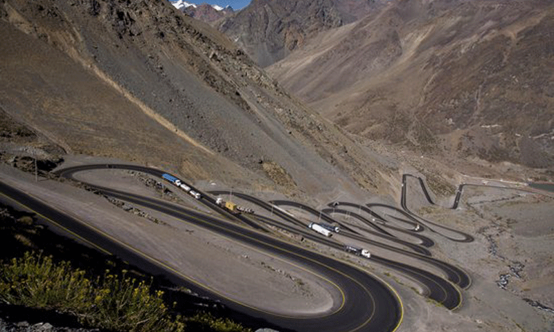 Los-Caracoles-Pass,-Chile _File PhotoLos Caracoles Pass, Chile: This road passes through mountain Andreas between Chile and Argentina.The road has many steep slopes and sharp turns without fences security.