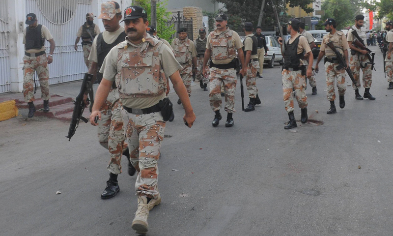 —Photo by Express TribuneKARACHI: Two suspects were arrested by the Pakistan Rangers Sindh during a search operation in Scout Colony here on Wednesday.