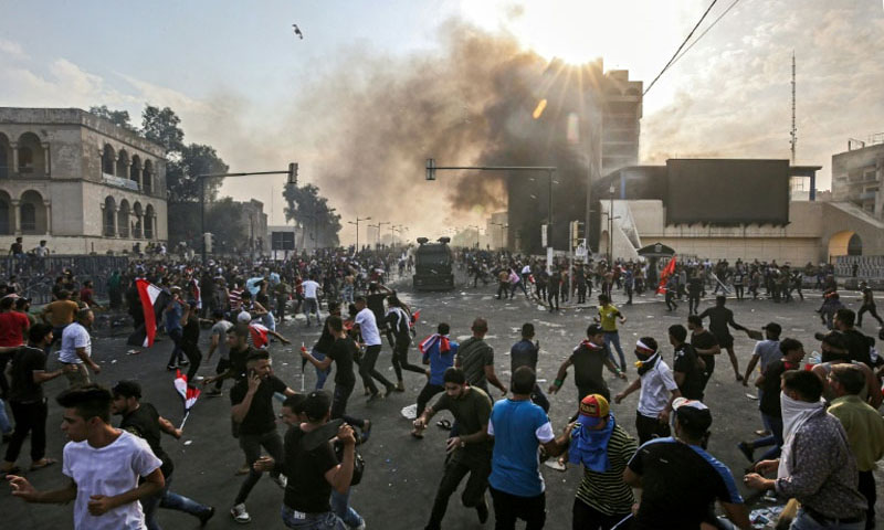 As dusk fell in Baghdad, crowds swelled around the capital's oil and industry ministry, pledging to march to the capital's emblematic Tahrir (Liberation) Square.