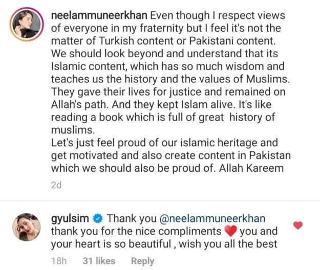 Neelum's sentiments were appreciated by many including Gülsim Ali, who responded to Munir on the post: