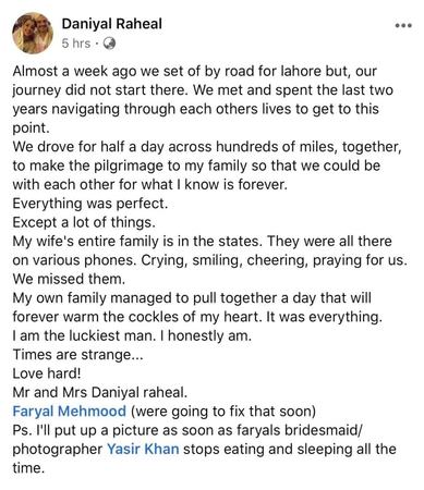 "Almost a week ago we set off by road for Lahore but our journey didn't start there. We met and spent the last two years navigating through each other lives to get to this point. We drove for half a day, across hundreds of miles together to make the pilgrimage to my family so that we could be with each other for what I know is forever," he shared and added, "Everything was perfect, except a lot of things – my wife’s entire family is in the states. They were all there on various phones, crying, smiling, cheering for us. We missed them.”