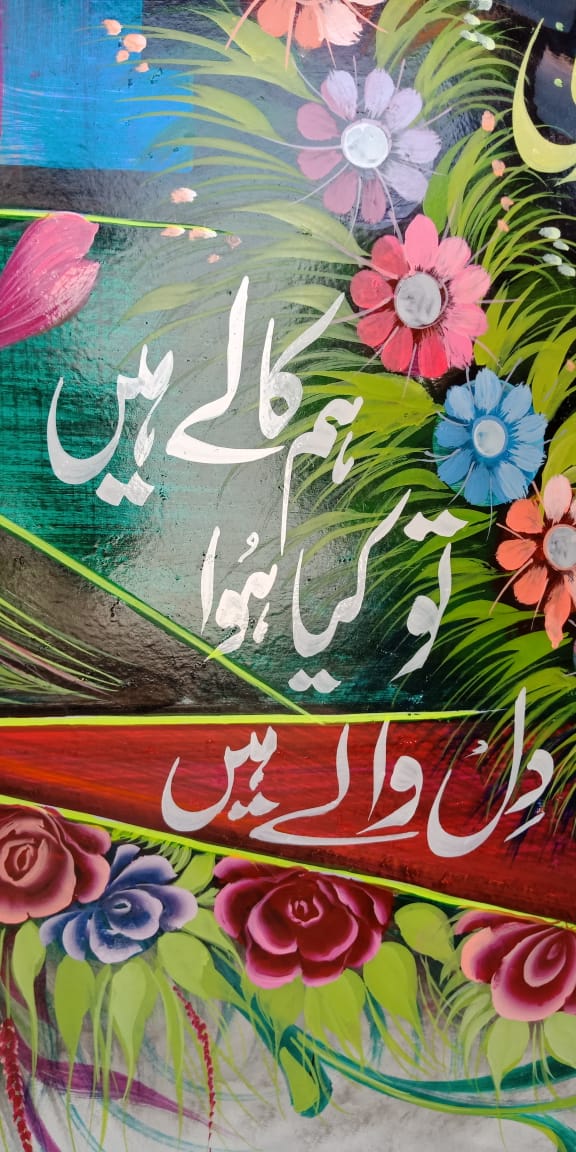 This mural also contains messages for equality and justice in a typical truck poetry manner. One slogan reads, "Hum Kalay hein to kiya huwa dil walay hein (Doesn't matter if we are dark-skinned, [what matter is] we have big hearts).