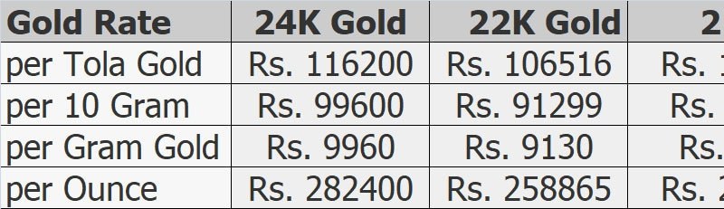Gold Rate in Pakistan Today is Rs. 99,747 for 10 gram 24K and Gold price for per tola is Rs. 116,343 (Updated 19 Oct...