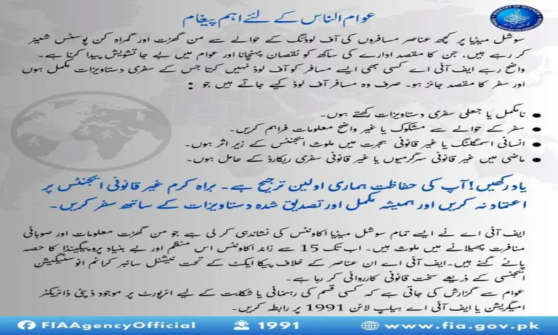 The Federal Investigation Agency (FIA) has urged citizens to beware of fake, misleading and fabricated social media posts regarding the offloading of passengers, calling them an attempt to create panic and damage the agency’s credibility.