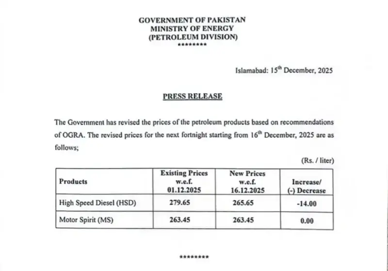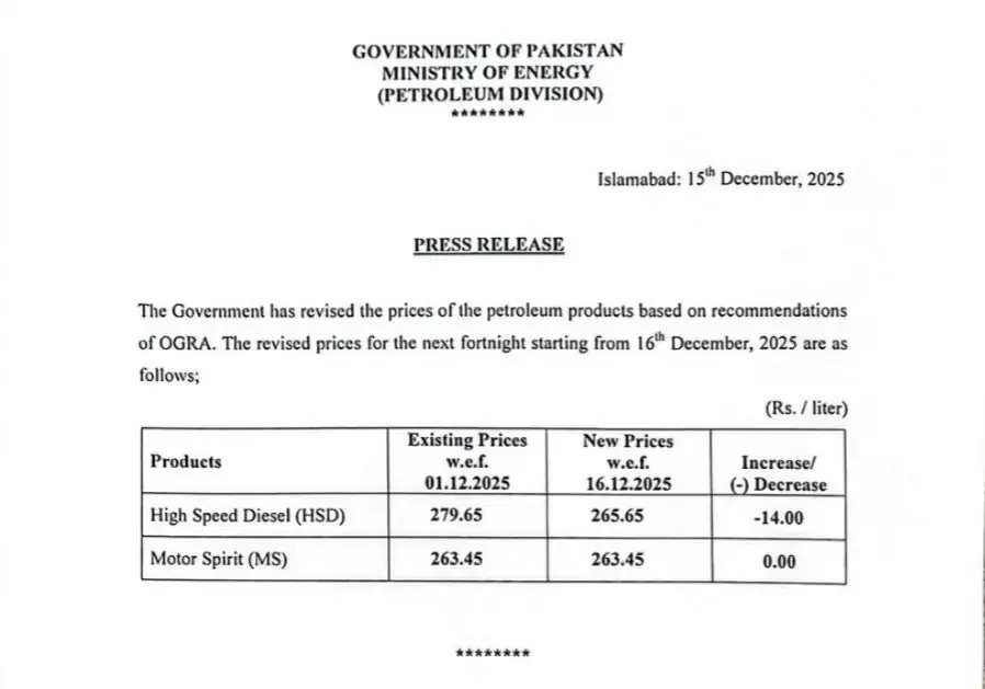 The price of high-speed diesel has been reduced to Rs265.65 per litre from Rs279.65 per litre.