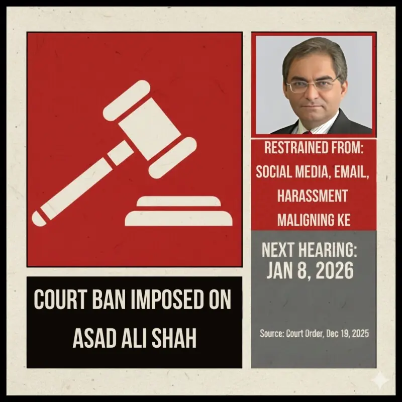 A court in Karachi has temporarily restrained former K-Electric director Syed Asad Ali Shah from making statements or taking actions that could harm the reputation of the power utility, after suspending an earlier order that had gone against the company.