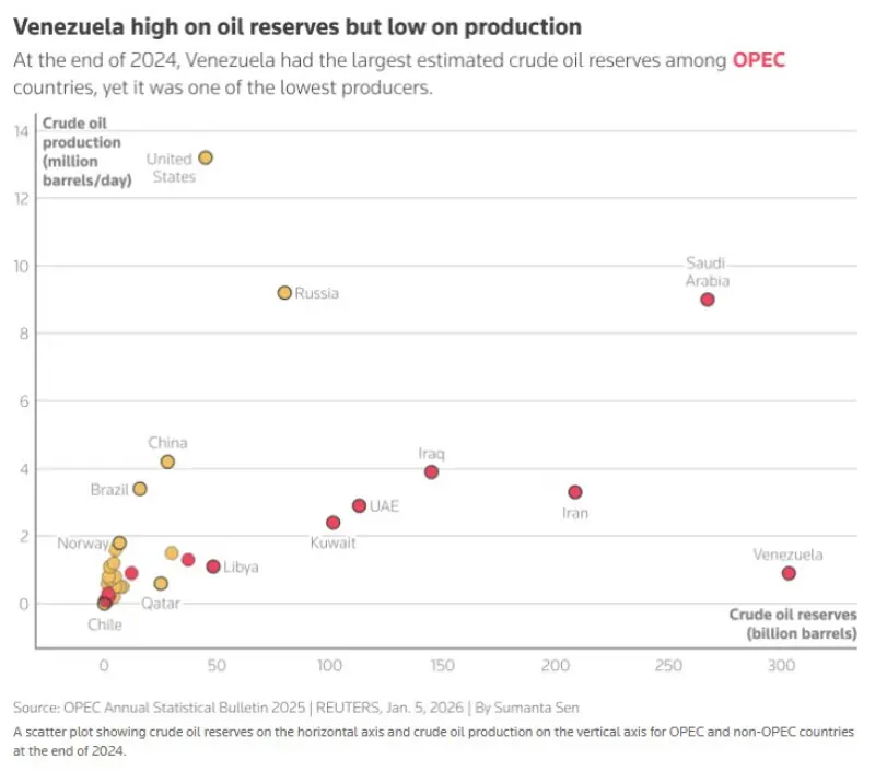 Venezuela has the world’s largest reserves - about 303 billion barrels - but the sector has long been in decline from mismanagement, under-investment and U.S. sanctions, averaging 1.1 million bpd output last year, a third of its 1970s heyday.
