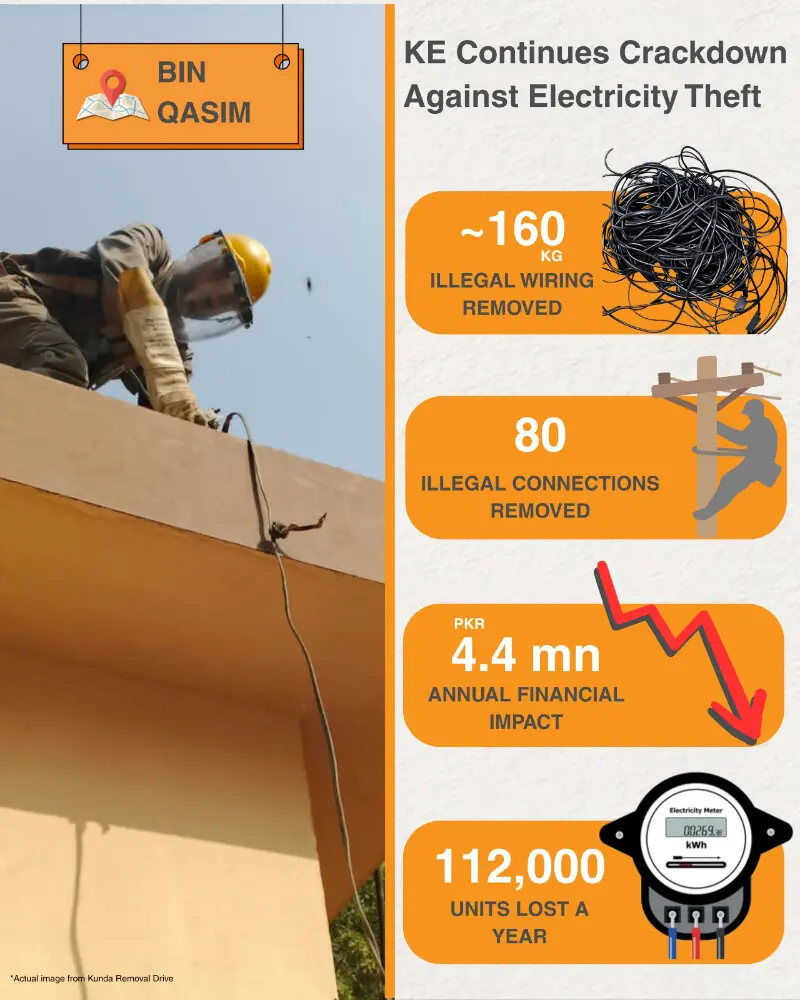 K-Electric (KE) has continued its crackdown against electricity theft, removing 80 illegal power connections weighing nearly 160 kilogrammes from unmetered commercial shops and hotels in Karachi’s Rind Goth area of Bin Qasim Town.