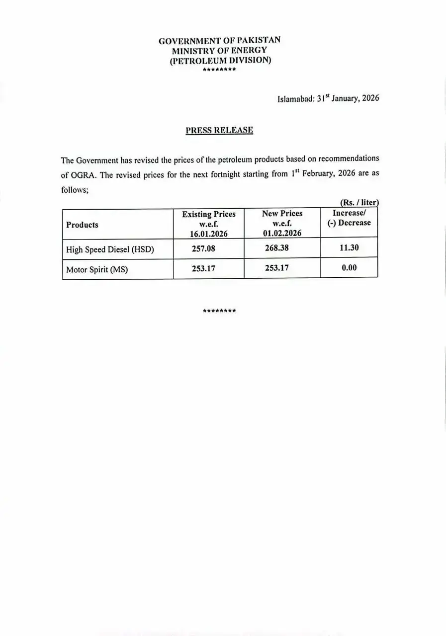 The decision follows recommendations from the Oil and Gas Regulatory Authority (OGRA) and will take effect from February 1.