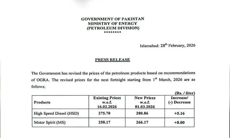 1 min readThe federal government has announced a sharp increase in petroleum product prices, raising the cost of petrol by Rs8 per litre and high-speed diesel by Rs5.16 per litre for the next fortnight.