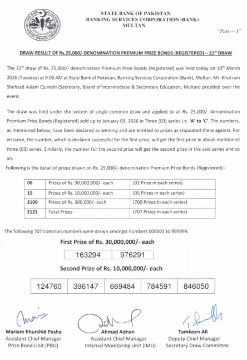 The government has announced the winners of the Rs25,000 denomination national prize bond draw held on March 10, 2026, in Multan.