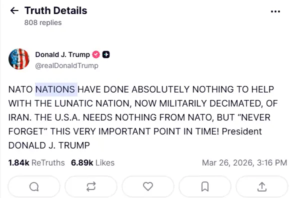 Trump also took aim at NATO countries, claiming they “have done absolutely nothing” to support the United States in dealing with Iran.