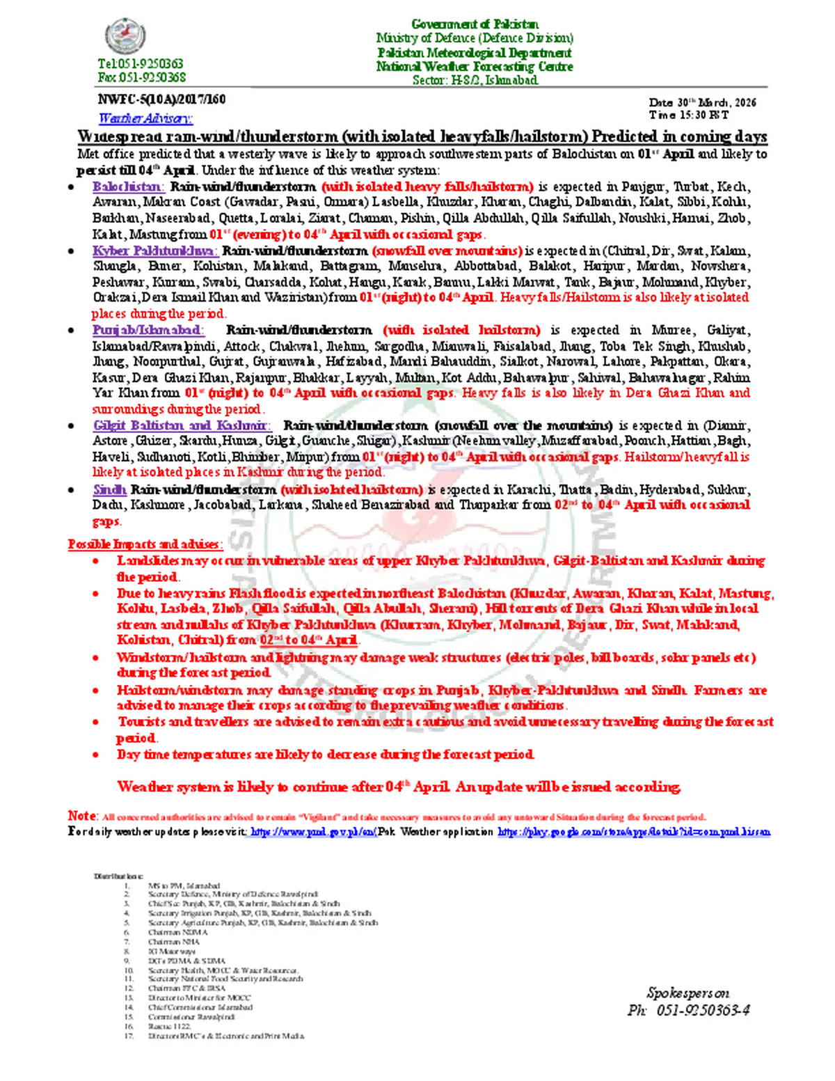 In Sindh, the Met Office forecast, rain-wind/thunderstorm (with isolated hailstorm) is expected in Karachi, Thatta, Badin, Hyderabad, Sukkur, Dadu, Tharparkar and other districts from April 2 to 4 with occasional gaps.