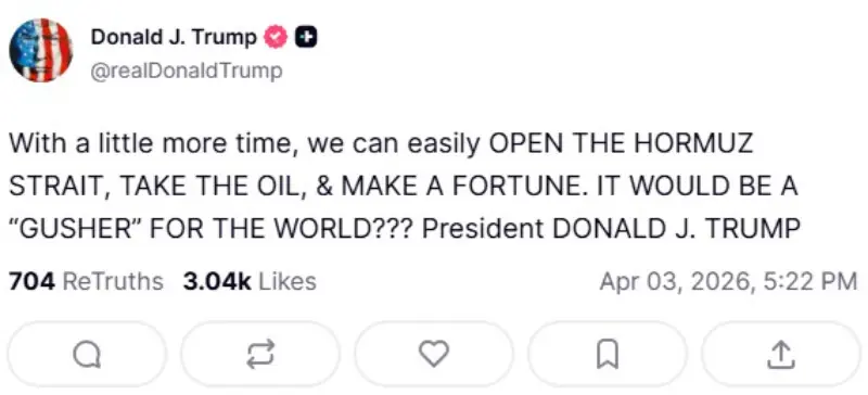 “With a little more time, we can easily OPEN THE HORMUZ STRAIT, TAKE THE OIL, & MAKE A FORTUNE. IT WOULD BE A ‘GUSHER’ FOR THE WORLD???” Trump posted.