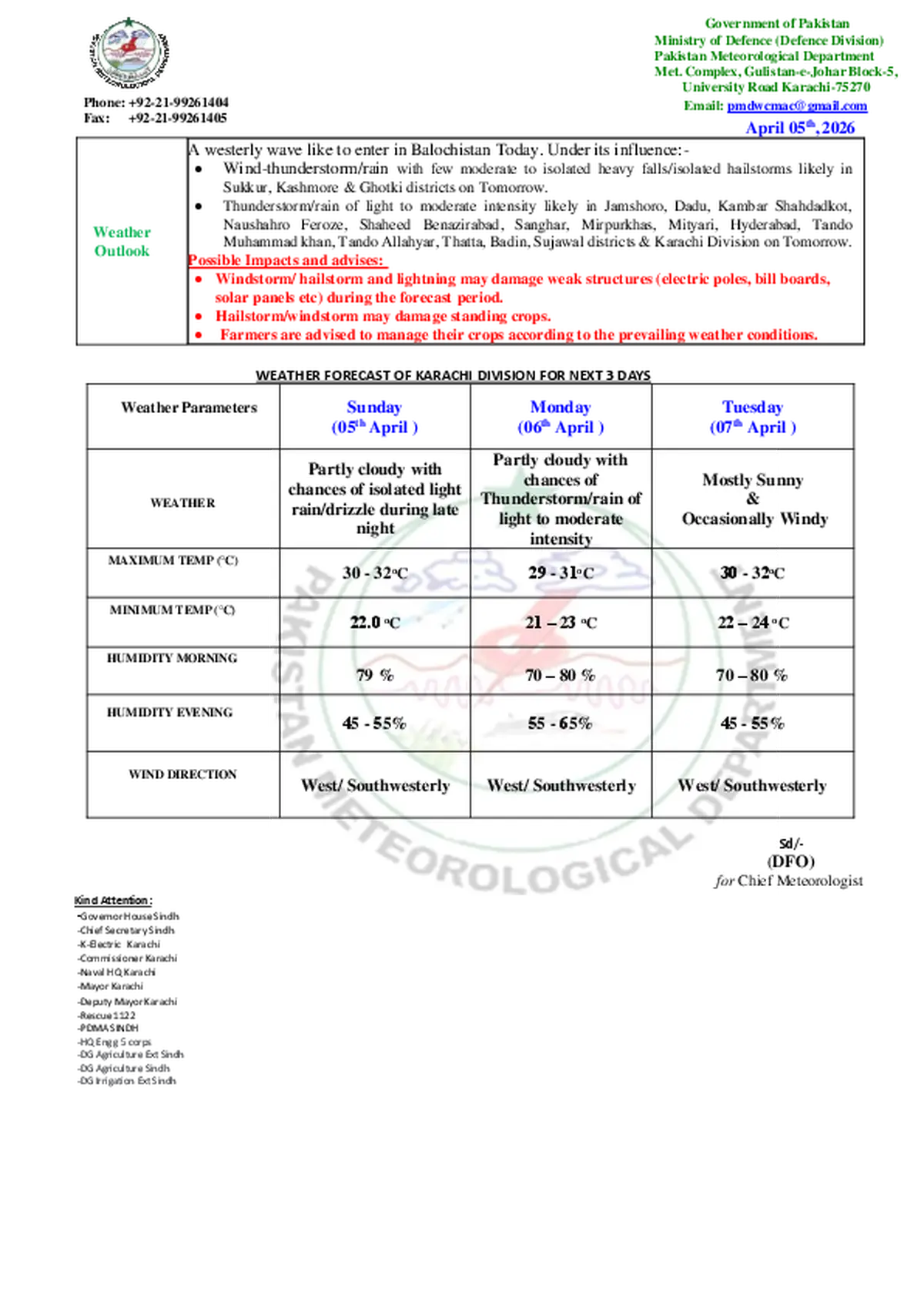 “Thunderstorm and rain of light to moderate intensity are likely in Jamshoro, Dadu, Kambar Shahdadkot, Naushahro Feroze, Shaheed Benazirabad, Sanghar, Mirpurkhas, Mityari, Hyderabad, Tando Muhammad Khan, Tando Allahyar, Thatta, Badin, Sujawal districts and Karachi Division on Monday,” it further added.