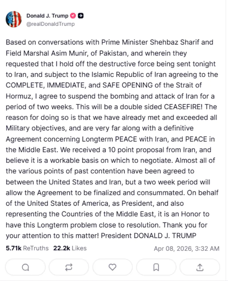 He described the arrangement as a “double sided CEASEFIRE” and said Iran’s 10-point proposal was a “workable basis on which to negotiate.”
