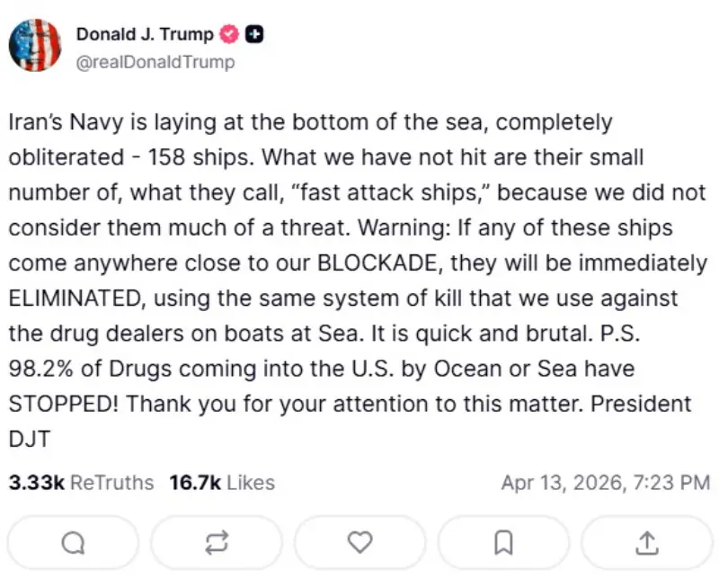 “Warning: If any of these ships come anywhere close to our BLOCKADE, they will be immediately ELIMINATED,” Trump said on his Truth Social network, adding that the rest of Iran’s navy had been “completely obliterated.”