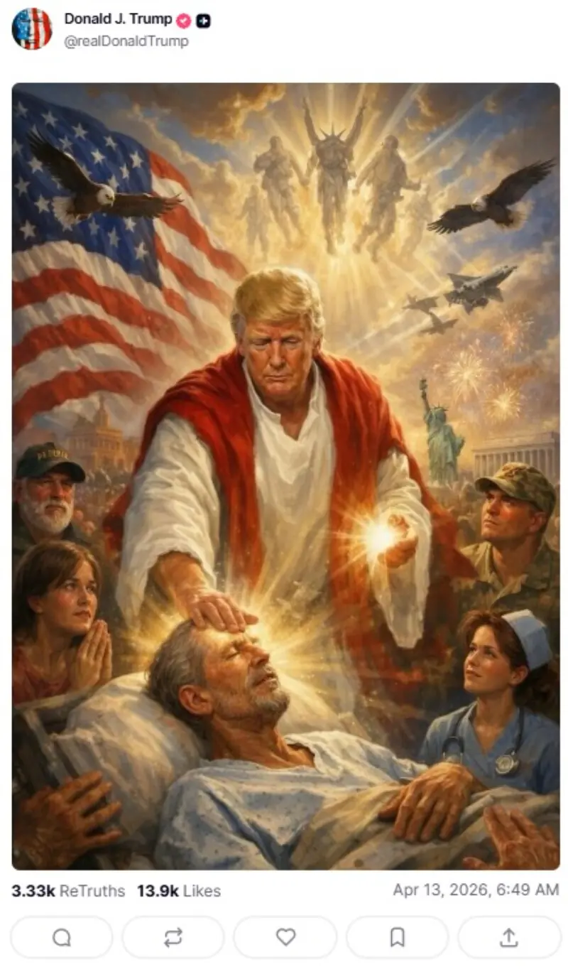 The image, posted on Trump’s Truth Social platform, shows him in a Christ-like pose appearing to heal a man lying in a hospital bed.