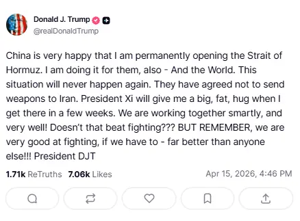 In his Truth Social post, Trump insisted that “China is very happy that I am permanently opening the Strait of Hormuz. I am doing it for them, also - And the World.”