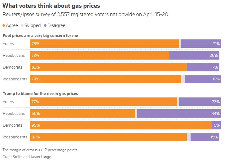 3 min readA clear majority of Americans blame President Donald Trump for surging gasoline prices, which is weighing on his Republican Party ahead of November’s congressional midterm elections, according to a Reuters/Ipsos poll.