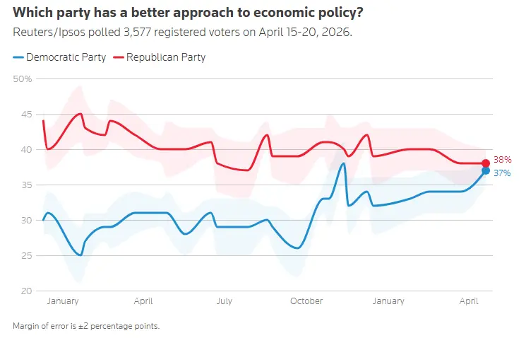 The latest survey, conducted April 15-20, showed 38% of US voters prefer the Republican approach to the economy compared to 37% who said Democrats are better on the issue. That one-point advantage for Republicans compares to a 14-point advantage the party had immediately after Trump started his second term in January 2025.