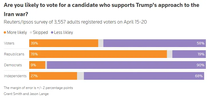 Some 58% of voters, including one in five Republicans and two-thirds of independents, said they would be less likely to support candidates in the November 3 midterms who support Trump’s approach to the conflict with Iran.