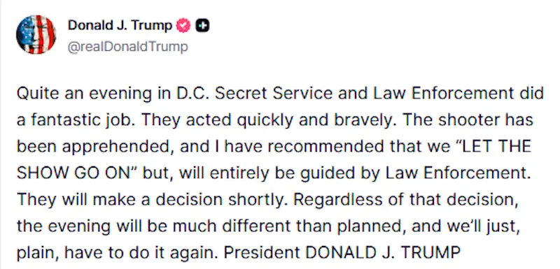 The US president was speaking to reporters at the White House after he and other senior US officials were evacuated from the annual White House Correspondents’ dinner on Saturday night following a shooting outside the ballroom.