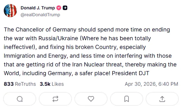 Trump criticises Germany's Merz, tells him to stop interfering over Iran